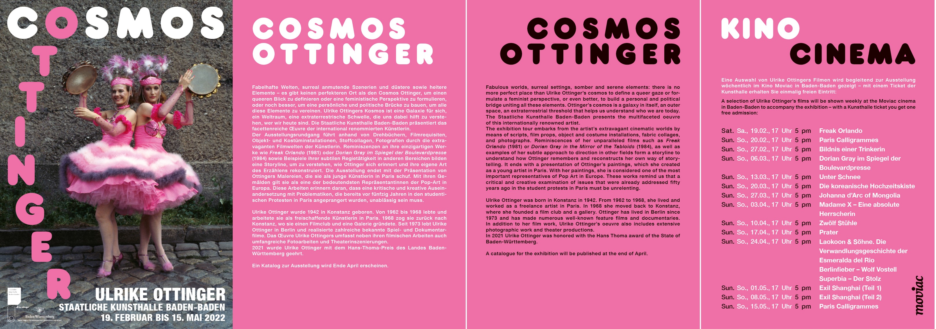 Eine Auswahl von Ulrike Ottingers Filmen wird begleitend zur Ausstellung wöchentlich im Kino Moviac in Baden-Baden gezeigt. Ein Katalog zur Ausstellung wird Ende April erschienen."