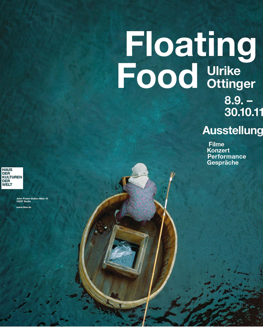 Durch fünf Kapitel (Floating Food / Wasserwege / Von der Hand in den Mund / Märkte / Opfergaben - Ritual) kann sich der Besucher die Ausstellung erwandern. Auf Wasserwegen und durch fiktive wie reale Welten spannt sich der gestalterische Bogen von der Antike bis in die Gegenwart: Das beginnt schon im Foyer, wo ein Wasserbassin, der Zisterne von Istanbul nachempfunden, spielerisch an den Seehandel zwischen Asien und Europa erinnert. Mit Sequenzen aus ihren Filmen macht Ulrike Ottinger den Dreiklang von Wasser, Speisen und Ritual plastisch. Stehende und bewegte Bilder führen auf eine Reise durch Garküchen, Häfen, Märkte, Tempel, zum mongolischen Schlachtritual und mexikanischen Opferaltar. In allegorischen Installationen entsteht eine Landschaft voller Sinnlichkeit mit Fabelwesen und Figuren aus dem einzigartigen Universum Ulrike Ottingers.