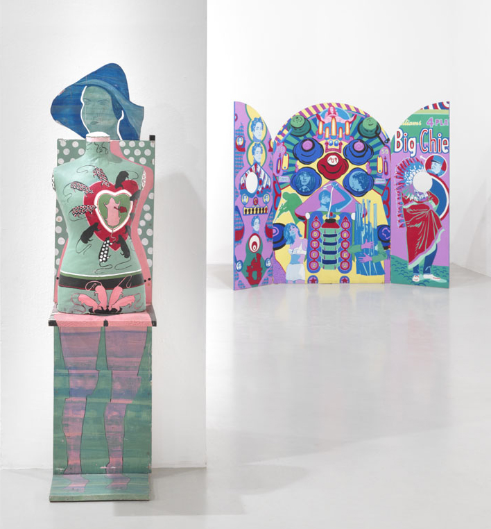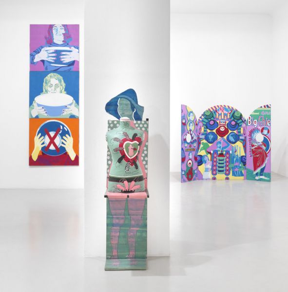 Schließlich erweiterte die Künstlerin die Malerei auch über den Rahmen hinaus auf das Tableau objet, die Objektmalerei, und integrierte sie in eigene Performances – vor allem den bemalten Puppentorso, der an der Säule im Raum steht.