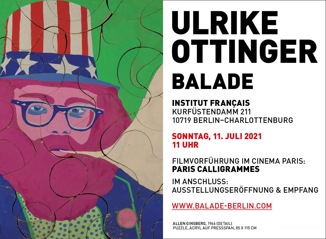 Im Rahmen des Kunstfestivals BALADE, ein von den Kuratorinnen Liberty Adrien und Carina Bukuts gestalteter Ausstellungspfad durch den Bezirk Charlottenburg, findet eine Ausstellung von Ulrike Ottinger im Maison de France / Institut Français Kurfürstendamm 211 in 10719 Berlin-Charlottenburg statt.