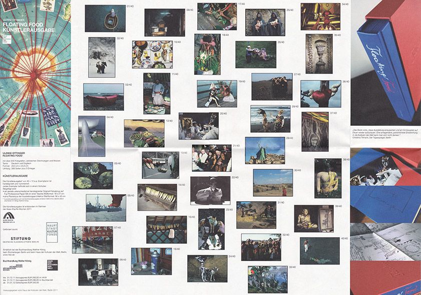 Ulrike Ottinger schafft hier erstmalig eine Collage aus vier Jahrzehnten ihres künstlerischen Schaffens: „Wasser und Essen sind elementarer Natur für die Menschheit. Wo also anfangen, diese in sämtliche Bereiche unseres physischen und geistigen Lebens mäandernden Dinge zu begreifen? Mich den Dingen, ihrer Natur, ihren ureigensten Bedingungen anzuverwandeln, gleichsam mitzufließen, dies war schon immer mein künstlerisches Prinzip.“ Auf Wasserwegen und durch fiktive wie reale Welten spannt sich der Bogen von der Antike bis in die Gegenwart: Die Bilder und Texte – Zitate von Homer bis in die Gegenwart – führen auf eine Reise durch Garküchen, Häfen, Märkte, Tempel, zum mongolischen Schlachtritual und mexikanischen Opferaltar. In fünf Kapiteln – Schwimmende Speisen, Wasser-Wege, Märkte, Von der Hand in den Mund, Opfergaben und Unter Schnee in Anlehnung an ihren neuesten Film, der im September 2011 Premiere feiert – entsteht eine Landschaft voller Sinnlichkeit aus dem einzigartigen Universum Ulrike Ottingers.