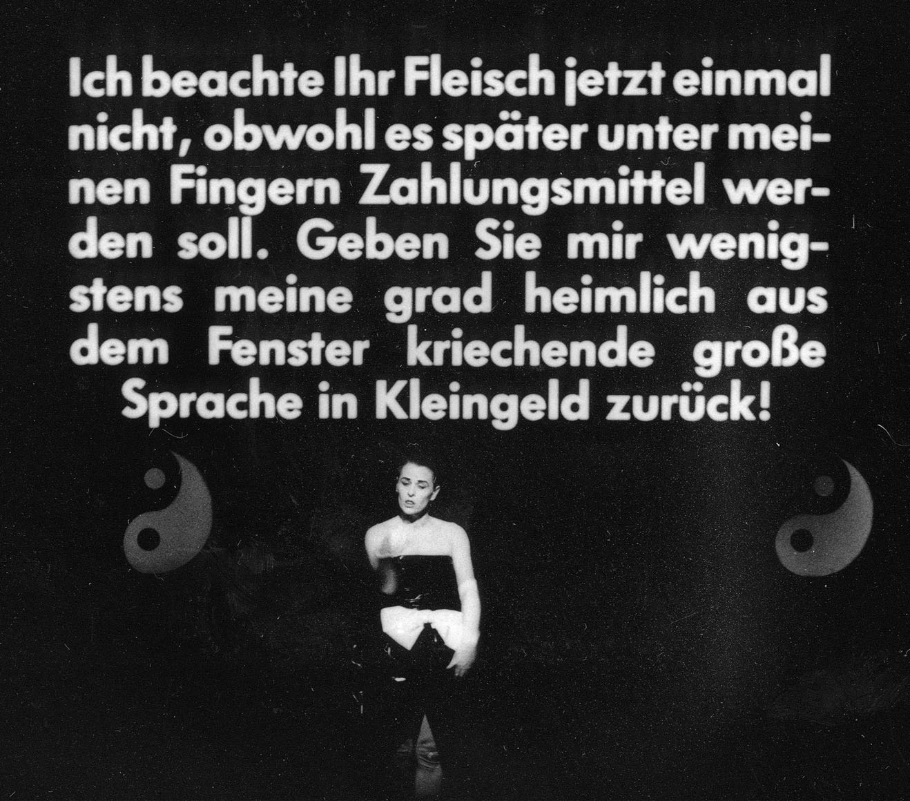 […] Die dramatische Geste konkurriert mit dem Schrifttext; gerade weil sie ihn wieder gibt, nicht vereinnahmte durch Verdoppelung. Es ist falsch anzunehmen, der Schrifttext geriete zum übergewichtigen Element dieses Theatertextes. Die Focussierung des Interesses durch Sinn-Isolierung macht sehen auf der Bühne Sinn-voll.