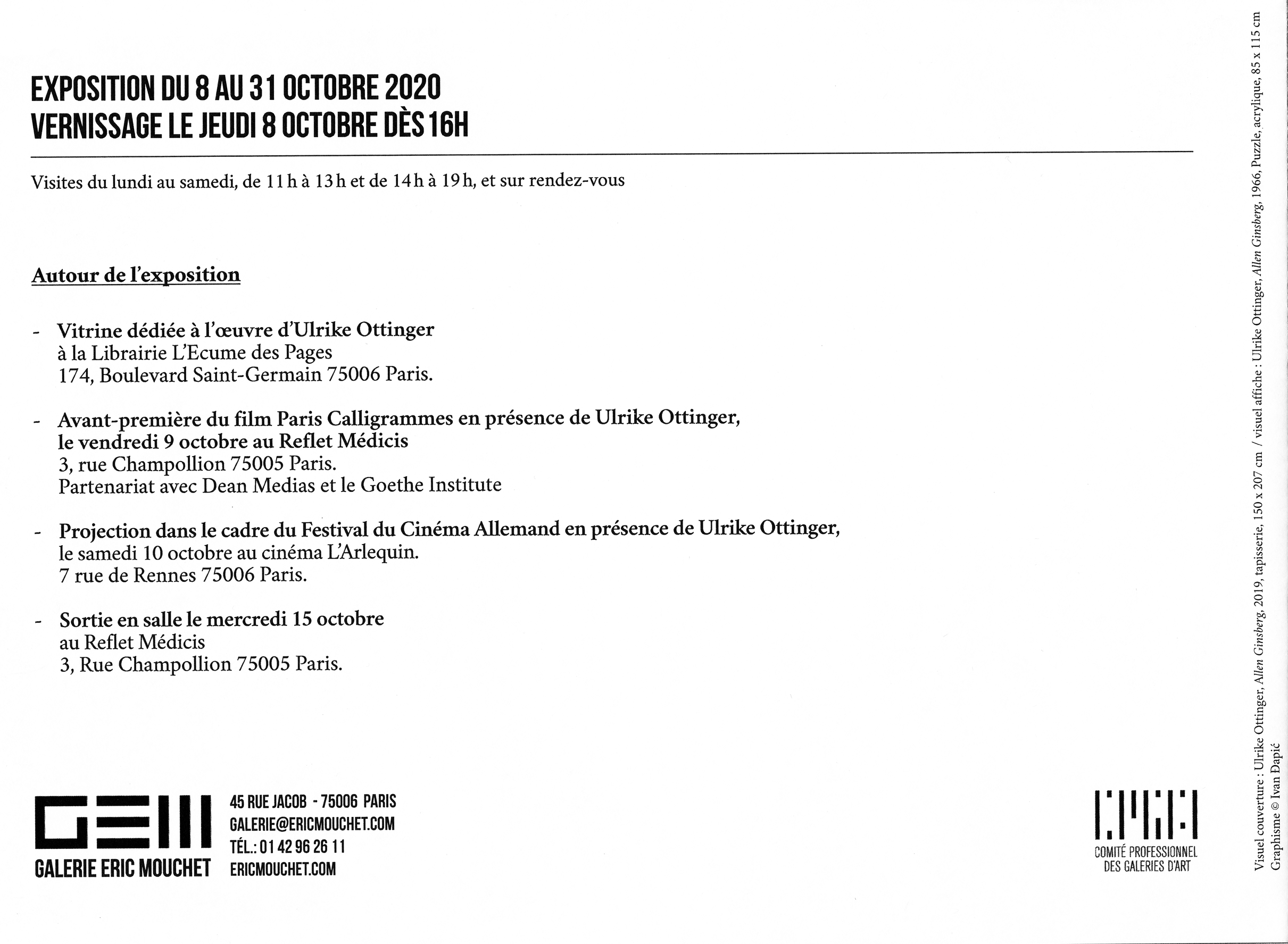 The path woven of images, archives and contemporary shots of Paris sometimes appears to take on the postcard allure of the Saint-Germain-des-Prés life: the bustle of cafés and clubs, the constant flow of visitors into the Cinémathèque française at Chaillot, which sets off Ottinger’s interest in cinema, the classes taught by Bourdieu, Lévi-Strauss and Althusser at the Sorbonne, the empty rooms of the Gustave Moreau Museum and the Louvre’s treasures. Yet ambivalence reigns, in the image of this time of contradictions. After World War II, optimism and progress seem to have no limits. The technical innovations revolutionize domestic interiors and the limits of the known world. Consumption is encouraged by happy, colorful ads. Yet, the world is agitated by conflicts linked to de-colonization. The Evian Agreements ending the Algerian War are signed the year of Ottinger’s arrival in France. She sees in the remains of the Garden of Tropical Agriculture’s pavilions, at an auction at the Hôtel Drouot or in the hair salons of the Faubourg Saint-Denis so many accounts of French colonial history. Between conservatism and libertarian aspirations, this decade leads to the political strife of May 1968: Ulrike Ottinger leaves Paris just a few months later.From artist to filmmaker, and back again Arriving in Paris as a young artist (she studied painting at the Munich Academy of Fine Arts), Ulrike Ottinger leaves the academy as a future filmmaker. She first passes through printmaking, with the aquatints of symbolic imagery of the Israël series that she creates in the studio of Johnny Friedlaender and shows at Fritz Picard’s bookshop, leading to her first rave reviews. She then adopts a pictorial practice, employing the colored language of narrative figuration, the French equivalent of American pop art. She makes paintings on different panels that, once assembled, resemble the classical form of an altarpiece. Their narration sometimes resembles the organization of comic strips, beginning with her dreamlike 1966 painting Bande dessinée (“Comic Strip”). The empty word bubbles are a recurring theme in her work, like in the 1967 screen print series Journée d’un GI (“A Day in the Life of a GI”), where the squares alternate between different moments in the daily life of an American soldier, or in her large-scale painting in the form of a puzzle, Allen Ginsberg (1965), in which the Beat poet is dressed up as Uncle Sam. After a complete film career honored by many awards, for the last decade Ulrike Ottinger has been returning to the artworks of her youth. Drawing on the long flânerie of Paris Calligrammes, which navigates through different registers of images, between reminiscence of the past and visions of the present, the artist has initiated a dialogue with her own pictorial creations, which she interprets on textile supports. The works are presented here for their French premiere."