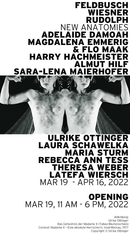 "Im Zentrum der Gruppenausstellung NEW ANATOMIES steht Ulrike Ottingers "Das Geheimnis der Madame X (Tabea Blumenschein)" aus dem Jahr 1977. Ausgehend von dieser ikonischen Fotografie haben Sara-Lena Maierhofer und Flo Maak Arbeiten von Kolleg*innen ausgewählt, die mit unterschiedlichen Aspekten von Ottingers Werk in Beziehung stehen und eigene Perspektiven auf Identität, Geschlecht, Körperlichkeit und Begehren einbringen.