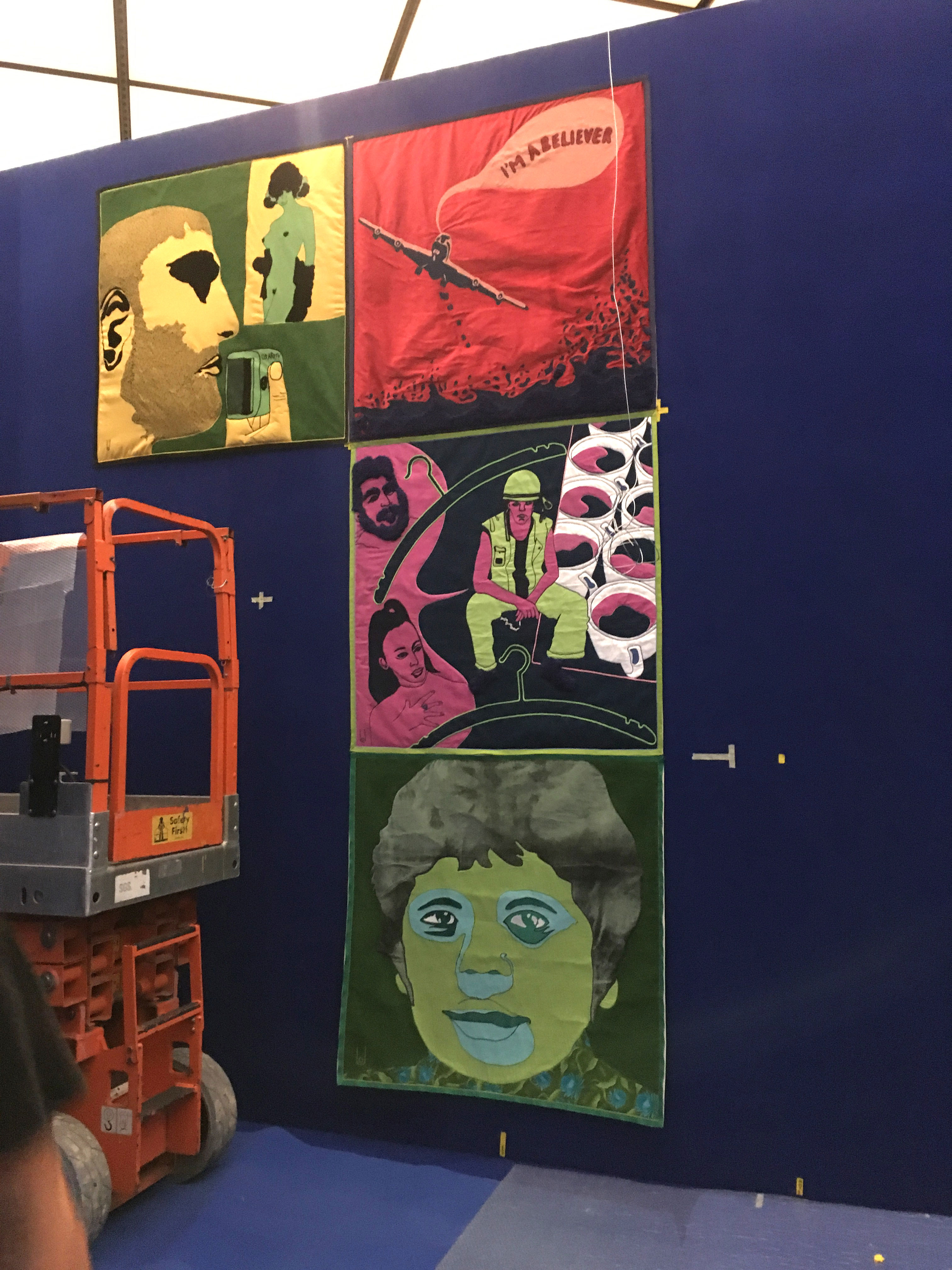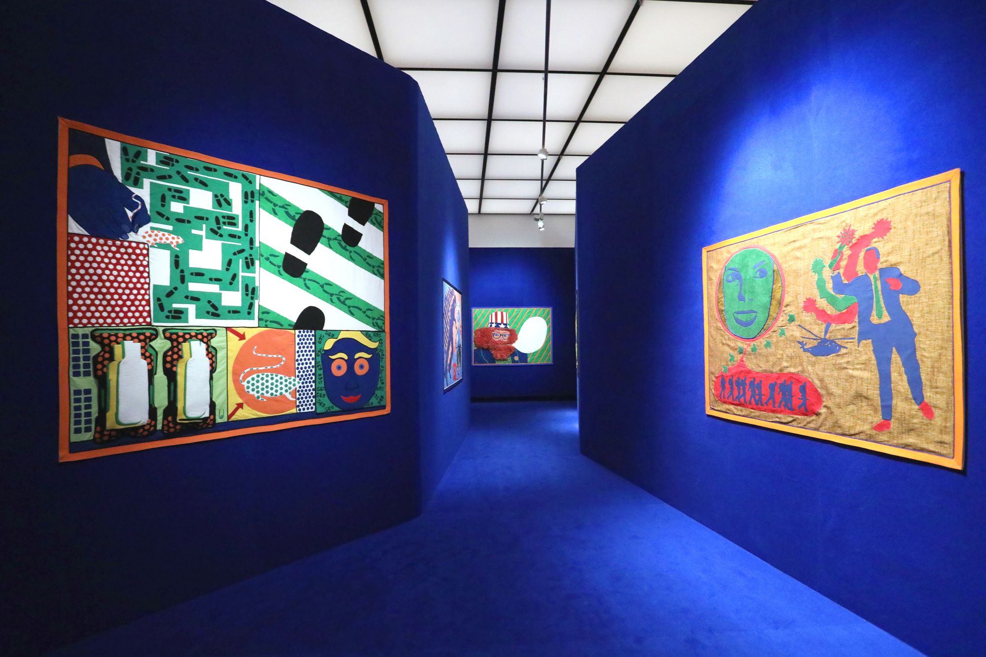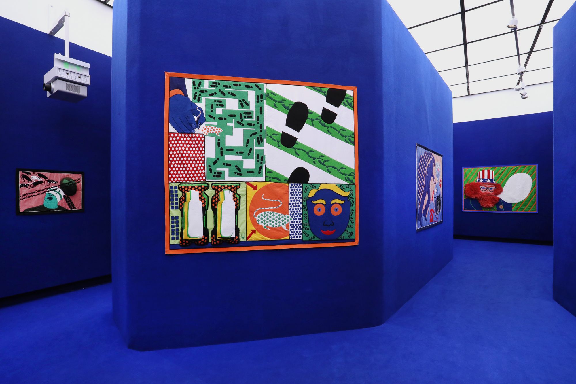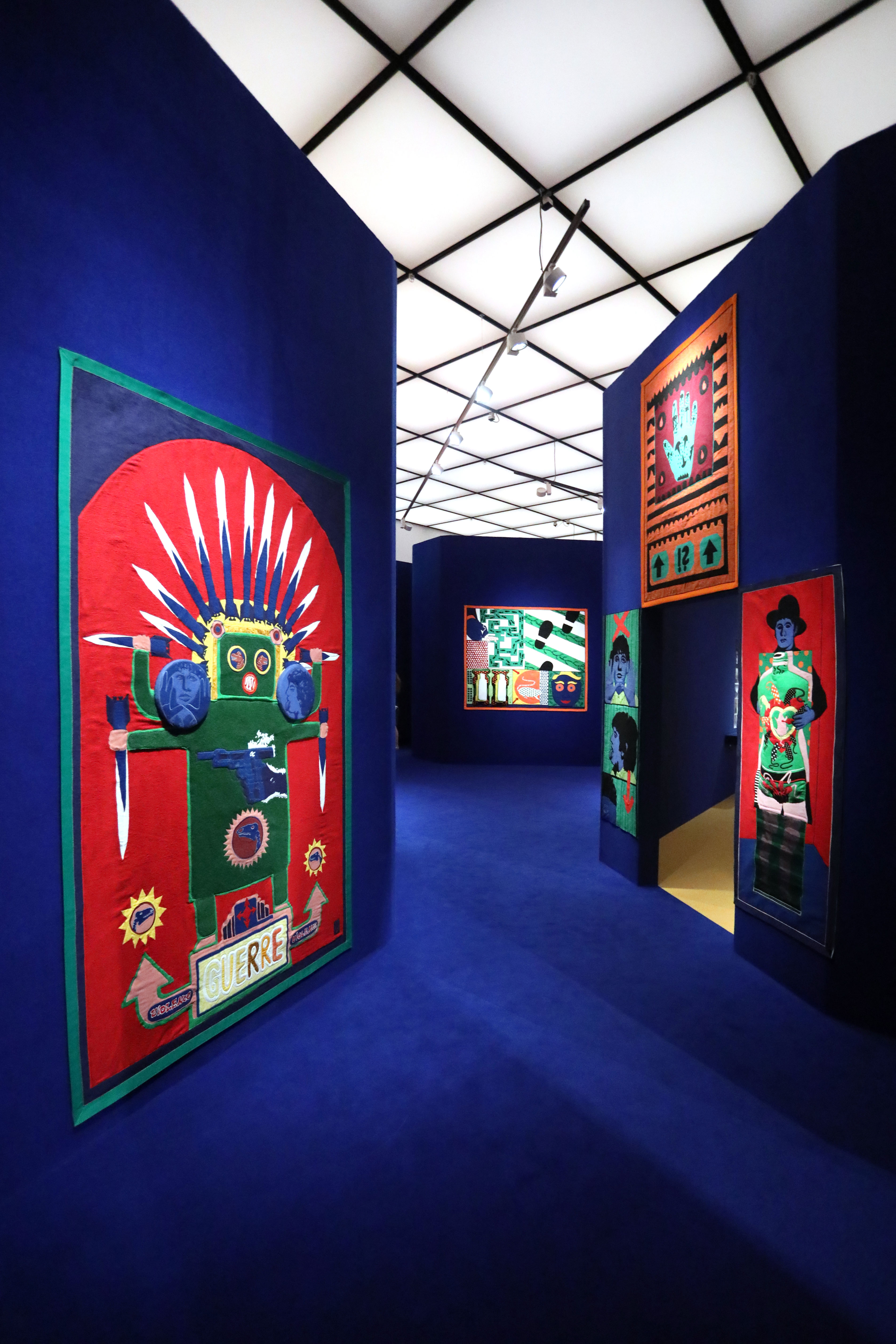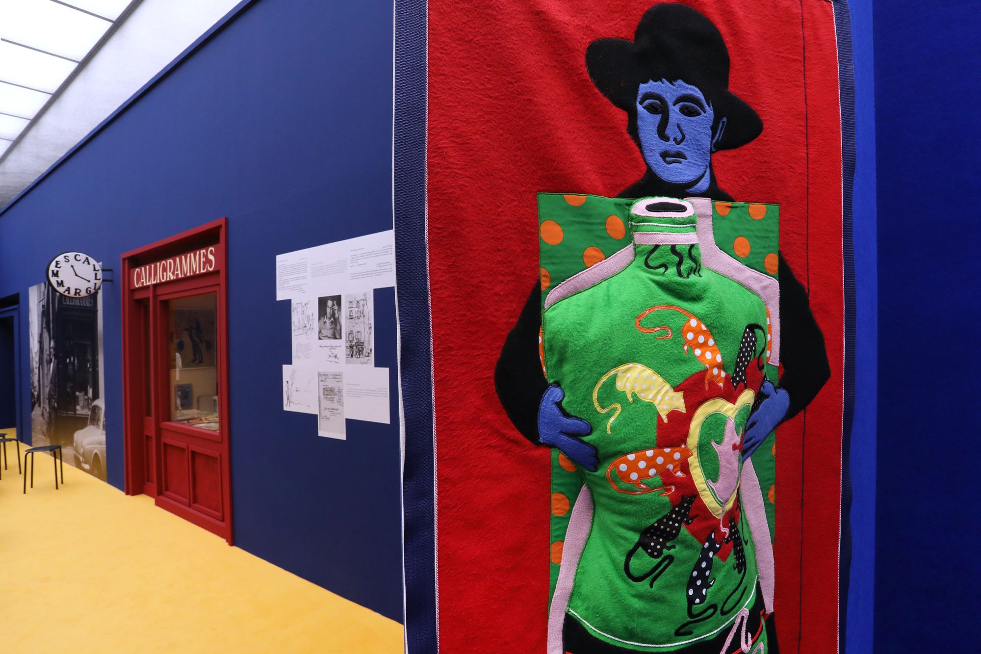 Paris Calligrammes is my personal memory landscape of this time, translated into the spatial. Photos, films, newspaper cuttings, sounds and music have been combined to create a dense assemblage of memory fragments. Their integration into an urban structure composed of soft textiles tells of the changes that the past undergoes on the path of memory. Streets with Pop Art paintings—in which I engaged with war and consumer culture—translated into fabric collages, point the way to spaces which were important fixed points for me: With Fritz Picard, the book dealer of the Librairie Calligrammes, and Walter Mehring, the sharp-tongued exiles, you enter my Parisian world of books. In the Parc Colonial you encounter the traces of French colonial history, or you follow Pierre Bourdieu and Ré Soupault on their precarious journeys to Algeria and Tunisia. Wherever you start or finish your little stroll there is one thing you should not miss: In the streets around today’s Gare du Nord you can observe the art of plaiting hair in the best hairdressers in the district; the results are also modern figure poems, in which history and the present, art and political statement condense.