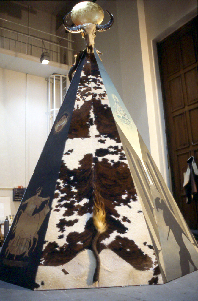 Das folgende Zeltsegment führt zurück auf die magisch-totemistische Materialität eines schwarzweiß gefleckten Stierfells, das einer Landkarte ähnlich vor uns ausgespannt ist. Der abgeschnittene Schwanz ist an die Dreiecksbasis appliziert; er züngelt sich wie eine Flamme empor und weist hinauf zur Spitze  des Zeltdaches, wo – wie zuvor das Gorgonenhaupt – der Stierschädel mit der Sonnenscheibe frontal, in seiner vollen suggestiven Bannkraft, thront.