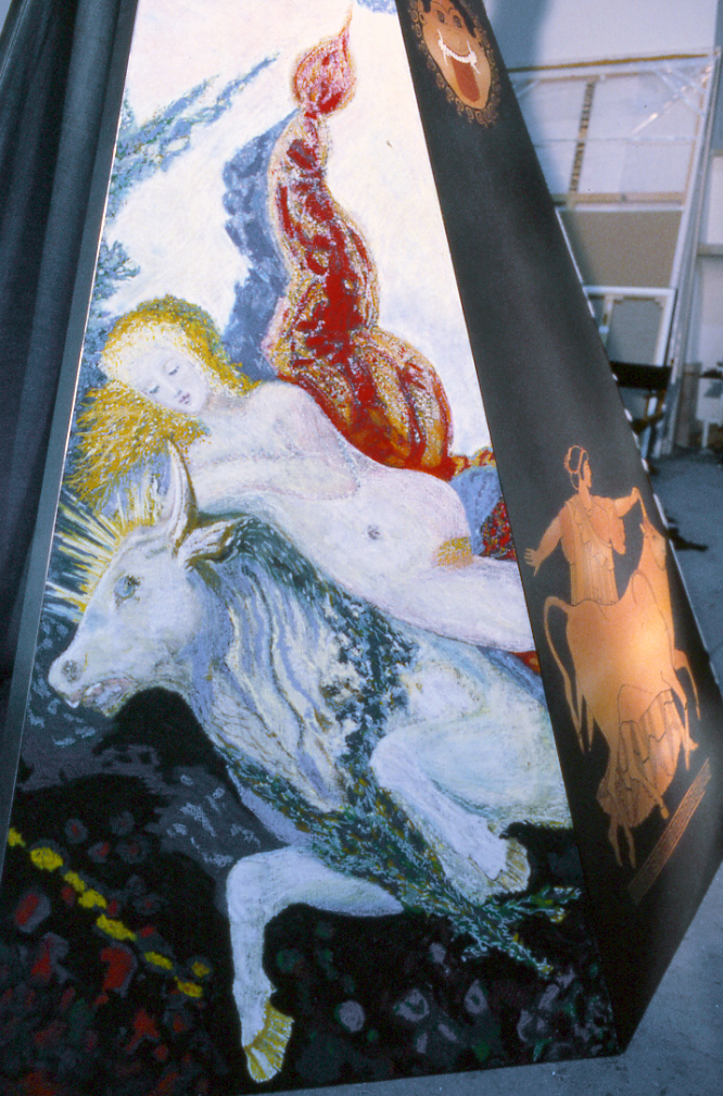 Ausgehend von den beiden Rahmensegmenten des Eingangs ist zur Linken das malerische Zitat einer expressionistischen Darstellung des Europa-Themas nach Max Beckmann[5] zu sehen, zur Rechten eine heiter-erotische Version von Gustave Moreau[6].
