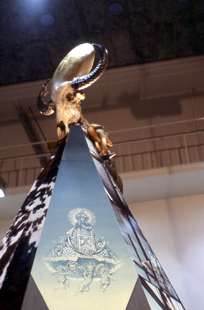 Eine konsequente Verschiebung bildet hier die nächste Bildkonstellation, die Zitate des „magischen Realismus“, der „pittura metafisica“ eines Giorgio de Chirico kombiniert mit einer zur Schablone geronnenen, puppenhaften Votiv-Madonna. Beide Aspekte versetzen uns in die mediterrane, hispanische Atmosphäre von Katholizismus und Stierkampf, von Machismo und seinem Komplement des latent matriarchalen Marienkults. Der Torero taucht jedoch nur noch als Schatten auf zwischen verödeter, antikisierender Monumentalarchitektur; sein Degen geht ins Leere. Im azurblauen Himmel darüber schwebt die Gnadenmadonna mit der Halbmondsichel bzw. dem Stiergehörn zu ihren Füßen. Im trichterartigen Schutzmantel doppelt sich die Zeltform der gesamten Installation, als berge die christliche Himmelsgöttin auch die archaischen Überlieferungen sowohl der jungfräulichen als auch der Muttergottheiten in sich. Gleichzeitig fungiert sie als deren Überwinderin, indem sie sich über die heidnischen Zeichen des Halbmondes und des phallischen Stierhorns erhebt, so wie sie der „Schlange den Kopf zertritt“.