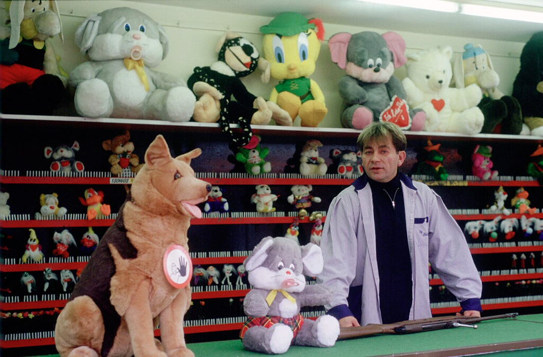 By day the Prater is inhabited by children and families. With big eyes, the children sit in go-carts or stare up at the puppet theater. At night the teenagers are magnetically drawn in, along with those who are still young at heart. The tea dance turns into a wild disco for lonely hearts. With their acrobatic thrashing to Eastern European rap rhythms, the teens prove that no centrifugal force can put them off balance. The members of a young gang try to prove themselves by slugging at the “Watschenmann,” winning a prize if they hit the human-like figure hard enough. And up above, the bright lights of the roller coaster sparkle. Ejection seats, carousels and scooters contend with the stars in the night sky. Reality and illusion, past and present: it’s all a part of this wild tryst.